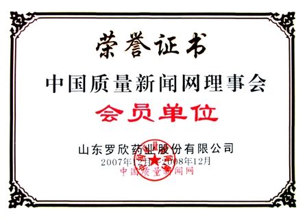 2007年12月,山東羅欣藥業股份有限公司再度榮獲由中國質量新聞網頒發的“中國質量新聞網理事會會員單位”榮譽證書。