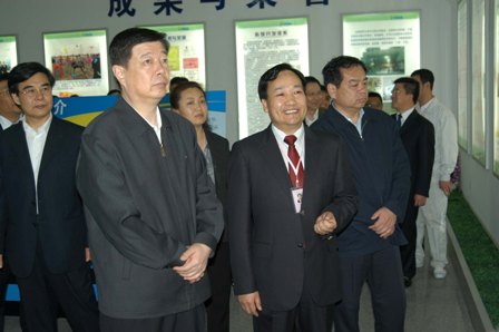 2008年4月7日,山東省委書記姜異康(前排右三)在山東省委常委、秘書長王敏(前排右一)、臨沂市委書記連承敏(前排右四)陪同下視察羅欣藥業。羅欣藥業董事長劉保起(前排右二)向姜書記介紹了公司發展情況。